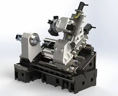 Il centro di tornitura con utensili motorizzati +CY è stato sviluppato sulla base di molti anni di esperienza nel campo della tornitura. La movimentazione assi è dotata di una vite a ricircolo di sfere ad alta precisione e di un sistema di cuscinetti ad alta precisione. Questo consente di eliminare efficacemente il gioco e compensare la dilatazione termica, garantendo una qualità costante dei pezzi finiti con un elevato indice CP. L'asse Y è realizzato utilizzando un carro aggiuntivo inclinato di 30 gradi con una struttura composita. Questo schema garantisce la massima rigidità e stabilità del meccanismo. La superficie di scorrimento è dotata di elementi antiusura in Turcite. Sono garantite caratteristiche di precisione di movimento nel lungo periodo anche in presenza di lavorazioni ad avanzamenti elevati. Il design della macchina offre un equilibrio ideale tra potenza, stabilità e precisione. Il design compatto del tornio garantisce un'elevata produttività di lavorazione.