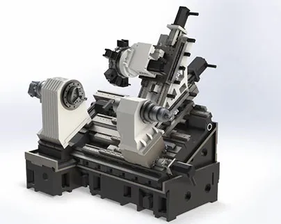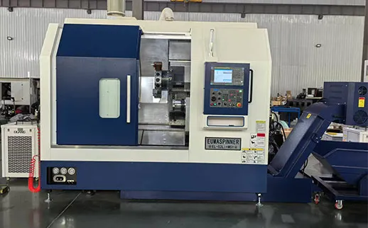 Il centro di tornitura con utensili motorizzati della serie +MSY è dotato di basamento standard in ghisa grigia HT300 con inclinazione di 30°, guide lineari. L'asse Y viene interpolato da due assi X tramite un carro aggiuntivo inclinato di 30°. La dotazione standard comprende elettromandrini di precisione EUMASPINNER sia per il mandrino principale che per il contromandrino, dotati di sistema di raffreddamento ad acqua, runout del mandrino non superiore a 0,001 mm, naso mandrino da A2-5 a A2-8. La gamma di diametri tornibili da ripresa va da 220 mm a 400 mm, lunghezze lavorabili da 400 mm a 850 mm. La torretta portautensili motorizzata a cambio rapido può essere di tipo BMT o VDI, il che consente di eseguire in modo efficiente sia le operazioni di tornitura che quelle di fresatura. Per ottenere alta precisione in produzione, si propone l'utilizzo di viti asfere di classe C0/C1. noltre, è possibile installare un sistema per il mantenimento della temperatura costante del corpo macchina, che consente di stabilizzare il processo di lavorazione e ridurre al minimo le deformazioni dovute alla temperatura.